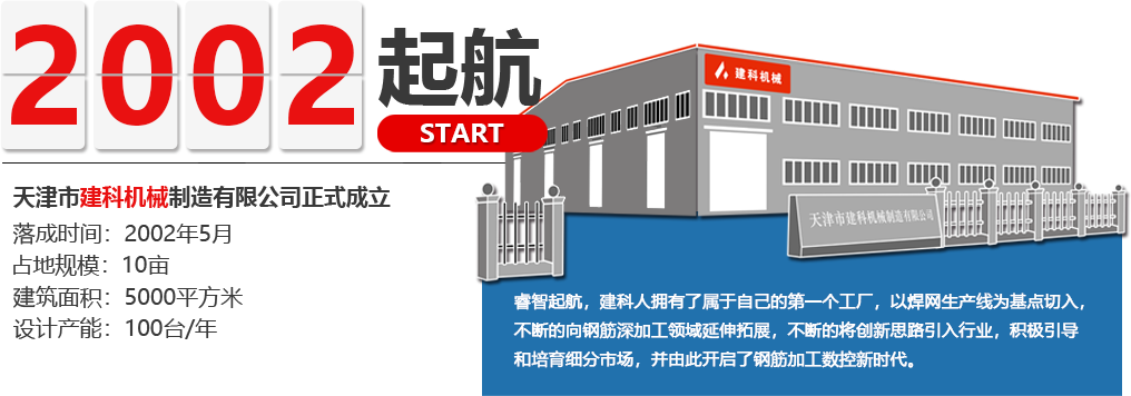 建科智能裝備制造(天津)股份有限公司成立于2002年5月,注冊資金:人民幣130,982,727元,主生產(chǎn)基地占地面積340畝。是中國智能化鋼筋加工裝備行業(yè)首家上市公司和行業(yè)領軍的國家級專精特新“小巨人”、高新技術企業(yè)、國家知識產(chǎn)權(quán)示范企業(yè)。